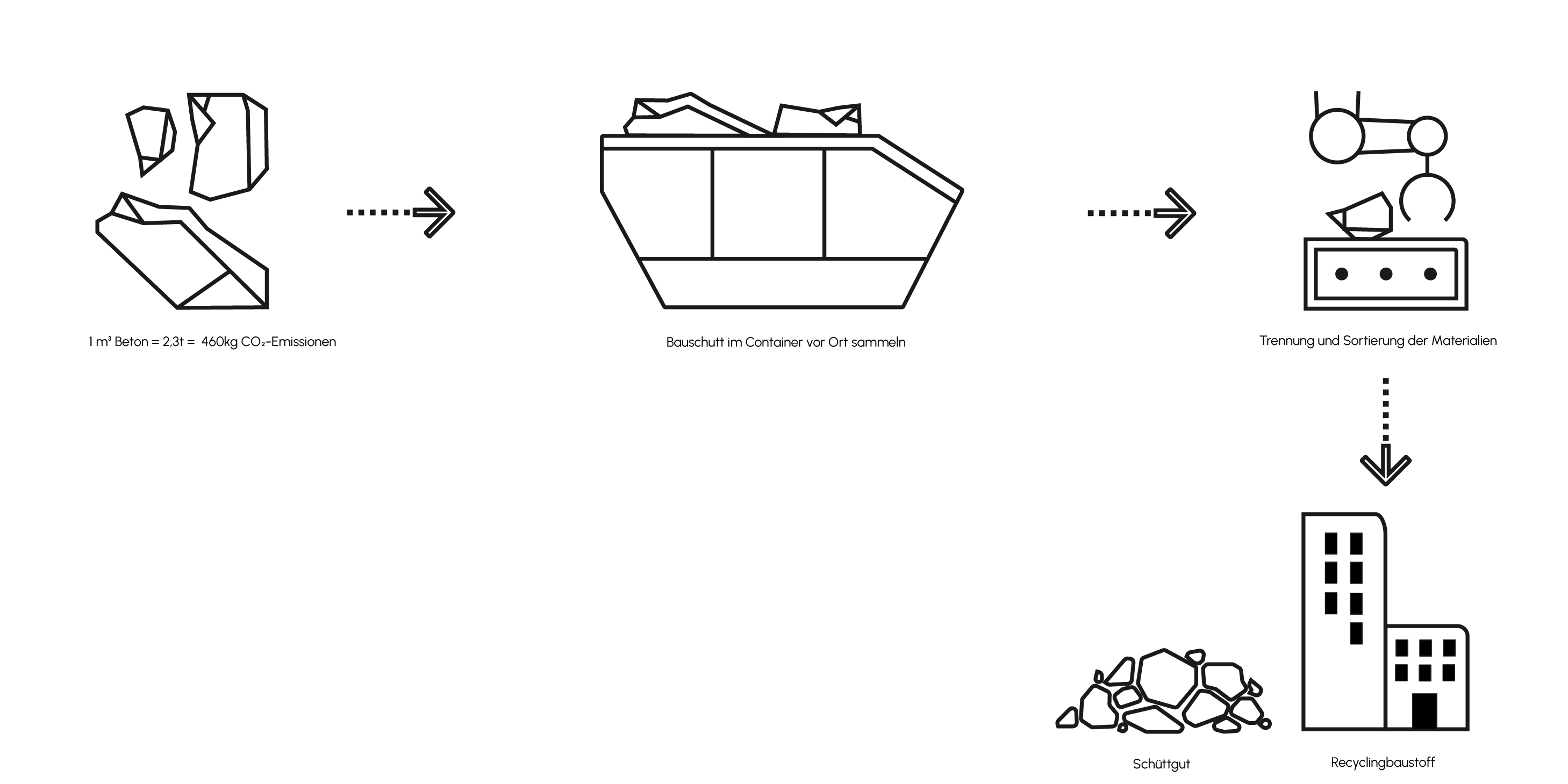 Durch die Wiederverwendung und das Recycling von Bau- und Abbruchabfällen werden wertvolle Ressourcen geschont, die Umweltbelastung reduziert und nachhaltige Baupraktiken gefördert. Die Herstellung von Beton ist energieintensiv und verursacht signifikante CO₂-Emissionen, hauptsächlich durch die Produktion von Zement, einem Hauptbestandteil von Beton. In Deutschland entstehen bei der Herstellung einer Tonne Zement etwa 600 kg CO₂. Dies entspricht ungefähr 200 kg CO₂ pro Kubikmeter Beton. Da 1 m³ Beton etwa 2,3 Tonnen wiegt, resultieren daraus CO₂-Emissionen von rund 460 kg pro Kubikmeter.